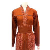 - Dress Batik Gamis dengan kerah V, kancing bungkus, lengan panjang, sabuk di pinggang (bisa di lepas), kerut di pinggang belakang.